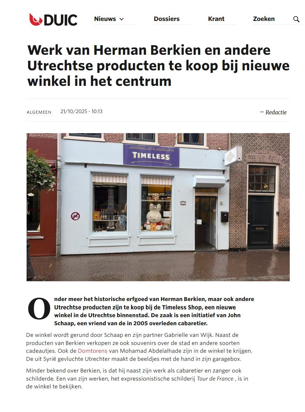 Ook DUIC heeft het gezien, John Schaap opent Timeless shop in Utrecht (Niet meer te zien ? Klik hier !) Onder meer het muzikale erfgoed van Herman Berkien, maar ook andere Utrechtse producten zijn te koop bij de Timeless Shop, een nieuwe winkel in de Utrechtse binnenstad. De zaak is een initiatief van John Schaap, een vriend van de in 2005 overleden cabaretier. De winkel wordt gerund door Schaap en zijn partner Gabrielle van Wijk. Naast de producten van Berkien verkopen ze ook souvenirs over de stad en andere soorten cadeautjes. Ook de Domtorens van Mohamad Abdelalhade zijn in de winkel te krijgen. De uit Syrië gevluchte Utrechter maakt de beeldjes met de hand in zijn garagebox. Minder bekend over Berkien, is dat hij naast zijn werk als cabaretier en zanger ook schilderde. Een van zijn werken, het expressionistische schilderij Tour de France, is in de winkel te bekijken.