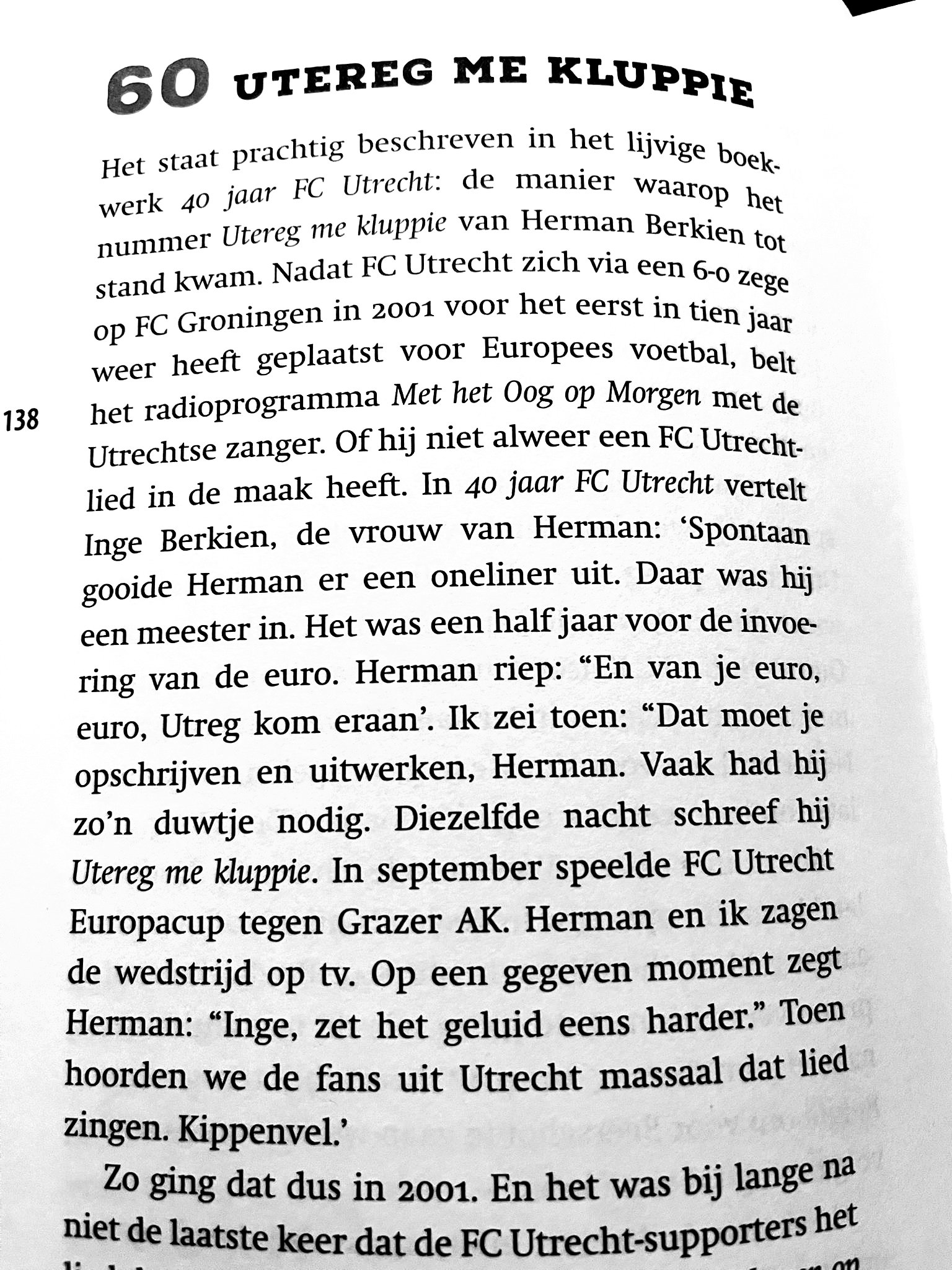60 UTEREG ME KLUPPIE Nadat FC Utrecht zich via een 6-0 zege op FC Groningen in 2001 voor het eerst in tien jaar weer heeft geplaatst voor Europees voetbal, belt het radioprogramma Met het Oog op Morgen met de Utrechtse zanger. Of hij niet alweer een FC Utrecht-lied in de maak heeft. In 40 jaar FC Utrecht vertelt Inge Berkien, de vrouw van Herman: ‘Spontaan gooide Herman er een oneliner uit. Daar was hij een meester in. Het was een half jaar voor de invoering van de euro. Herman riep: “En van je euro, euro, Utreg komt eraan’. Ik zei toen: “Dat moet je opschrijven en uitwerken, Herman. Vaak had hij zo'n duwtje nodig. Diezelfde nacht schreef hij Utereg me Kluppie. In september speelde FC Utrecht Europacup tegen Grazer AK. Herman en ik zagen de wedstrijd op tv. Op een gegeven moment zegt Herman: “Inge, zet het geluid eens harder.” Toen hoorden we de fans uit Utrecht massaal dat lied zingen. Kippenvel.’ Zo ging dat dus in 2001. En het was bij lange na niet de laatste keer dat de FC Utrecht-supporters het ... (einde citaat)