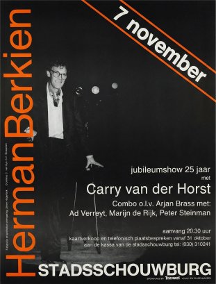 Herman Berkien Jubileumshow 25 jaar, 27 november 1988 07 februari 2026 Door Reinier van der Sandt Herman Berkien Jubileumshow 25 jaar, 27 november 1988 met Carry van der Horst Combo o.l.v. Arjan Brass, Ad Verrayt, Marijn de Rijk, Peter Steinman Aanvang 20:30 uur, Stadsschouwburg Utrecht. Helaas hadden wij het laatste deel van de show, waarin ongetwijfeld "Solitude" gezongen zou worden, maar dat wij wel vanaf het repeteermoment aan het begin van de video konden volgen, niet op videoband staan. Naar aanleiding van het werken aan deze show werd de langs speelplaat "Hoe Gekker, Hoe Lekker" in hetzelfde jaar gemaakt, maar dan in het Mirliton Theater in Utrecht. De video begint met de repetitie voor de show, daarna zien we beelden uit de foyer, en vervolgens zien we de zaal, en dan wordt het stil... de show begint !
